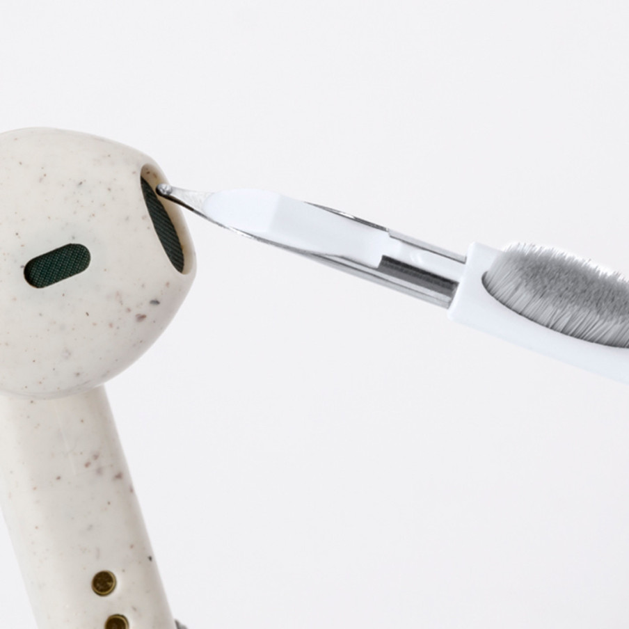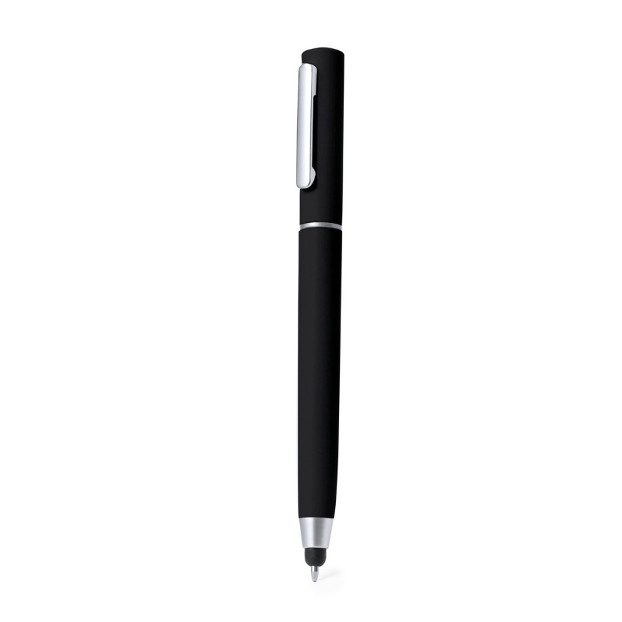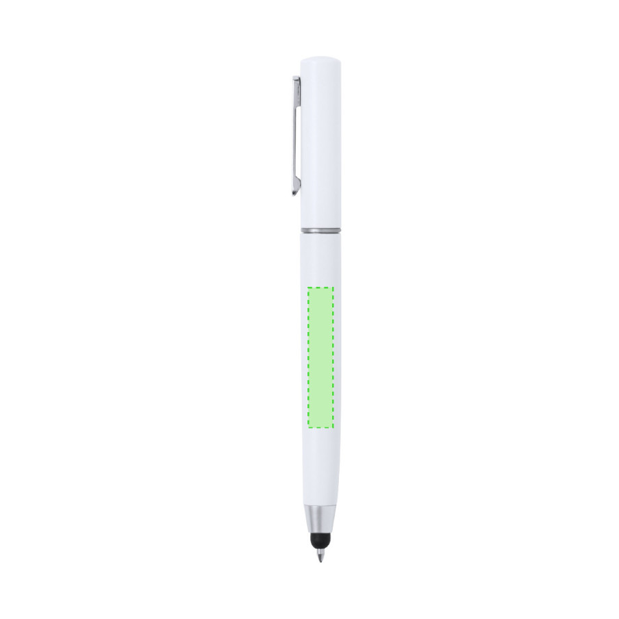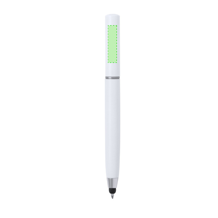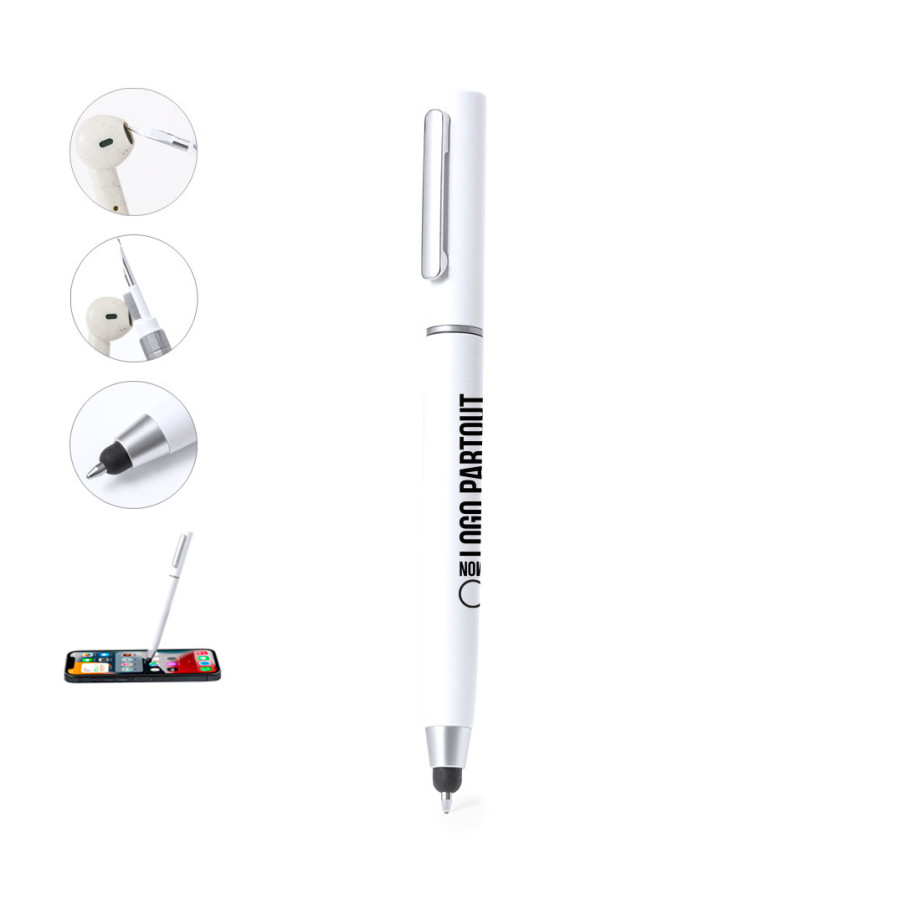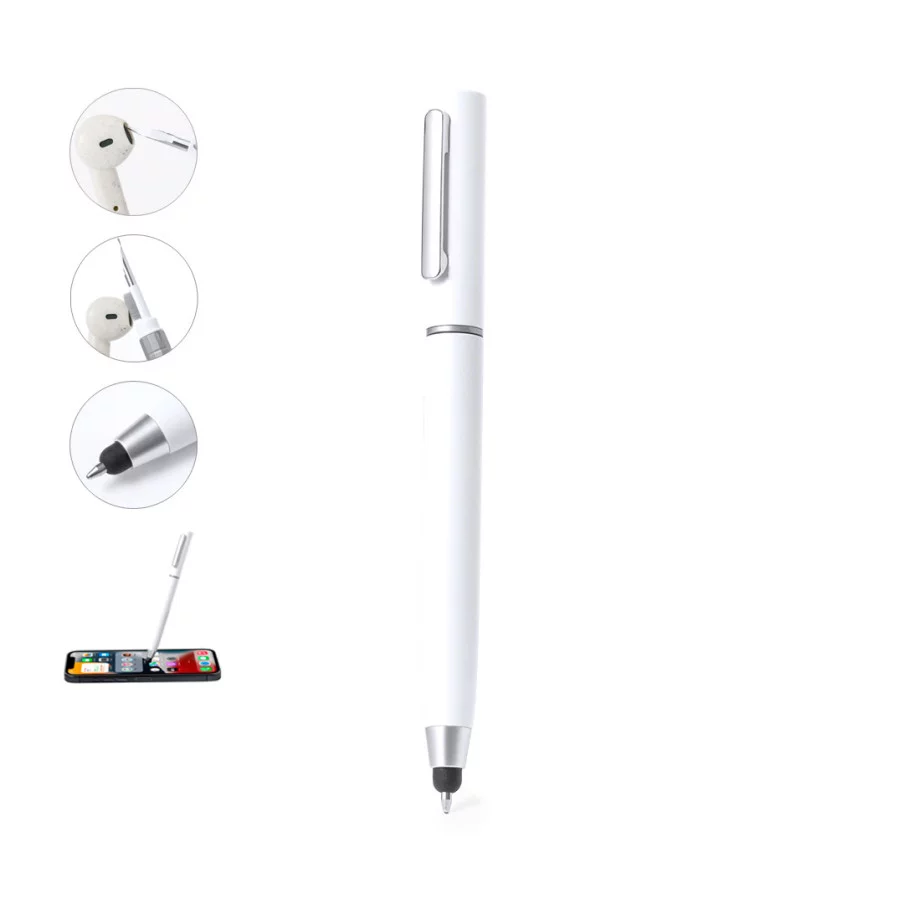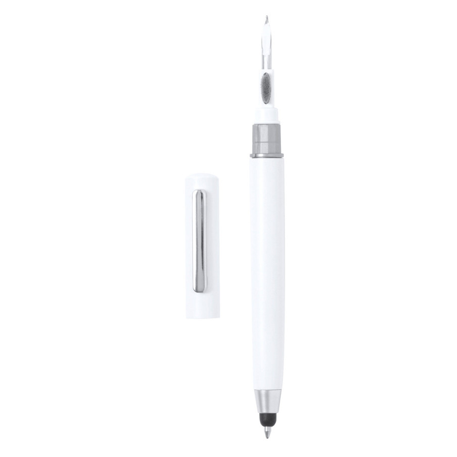 Ce stylo-bille pratique possède un mécanisme rotatif et des accessoires de nettoyage dans son haut de corps. Il est doté d'une brosse et d'une pointe en métal protégées par un capuchon ainsi que d'un clip en métal et d'une encre bleue.