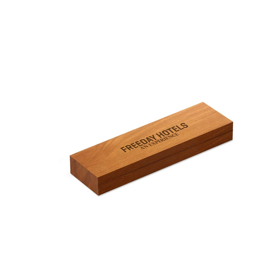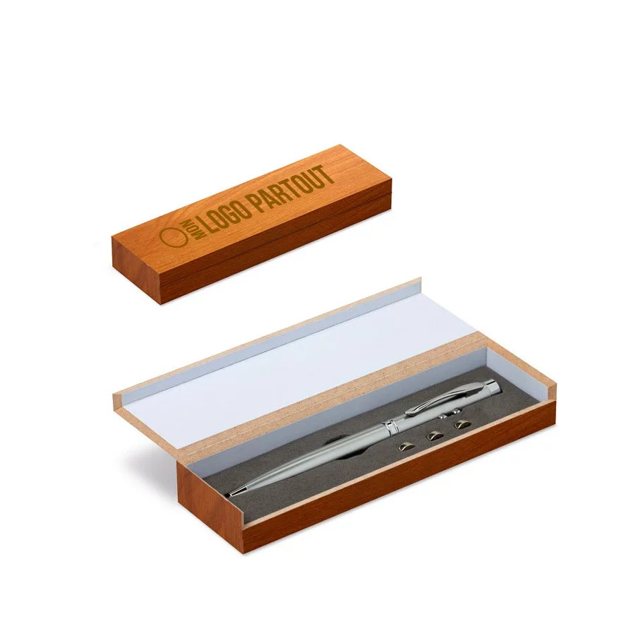 Goodies publicitaire multi action, découvrez un stylo personnalisable disposant à la fois d’un pointeur laser rouge, d’une lampe LED blanche. Un article publicitaire exceptionnel dans un écrin en bois également personnalisable