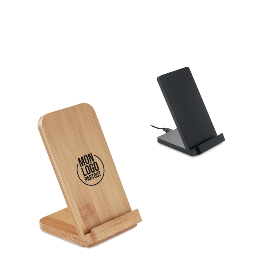 Personnalisez notre chargeur sans fil à double bobine pour un smartphone, entièrement intégré dans un boîtier en bambou et avec une fonctionnalité de support. D’une puissance de 5W, ce support publicitaire est compatible avec les derniers Androids, iPhone® 8, X et plus récents. Le bambou est un produit naturel, et présente de légères variations de couleur.