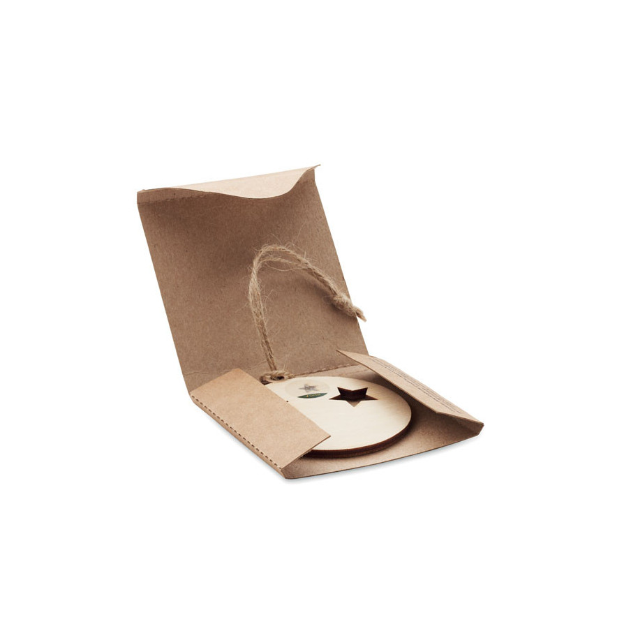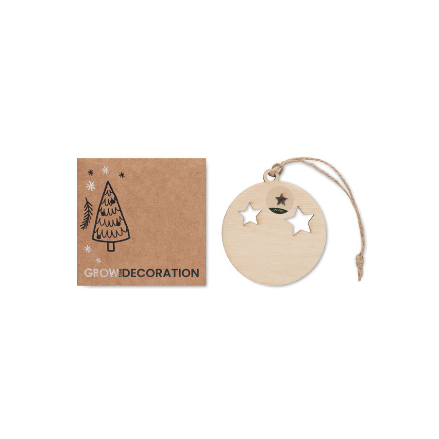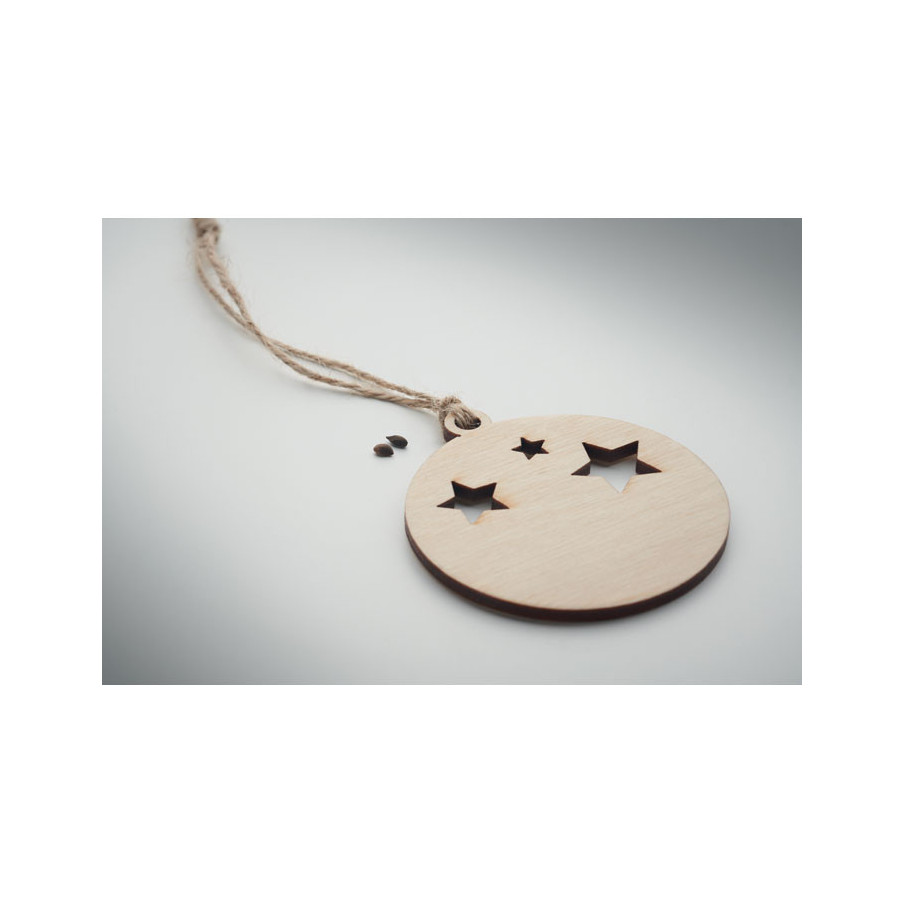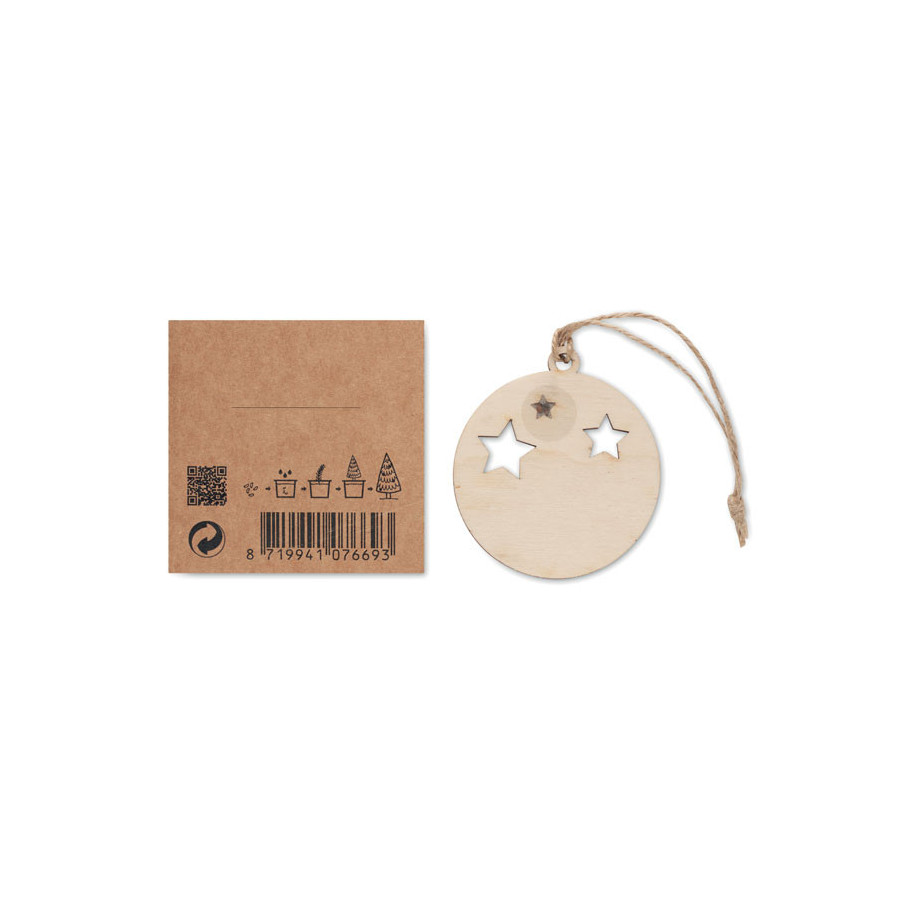 Cette suspension de Noël en forme de boule et fabriquée en bois est ornée de découpes en étoile et accompagnée d'un cordon en jute. Comprend des graines d'épicéa et présentée dans une enveloppe kraft.