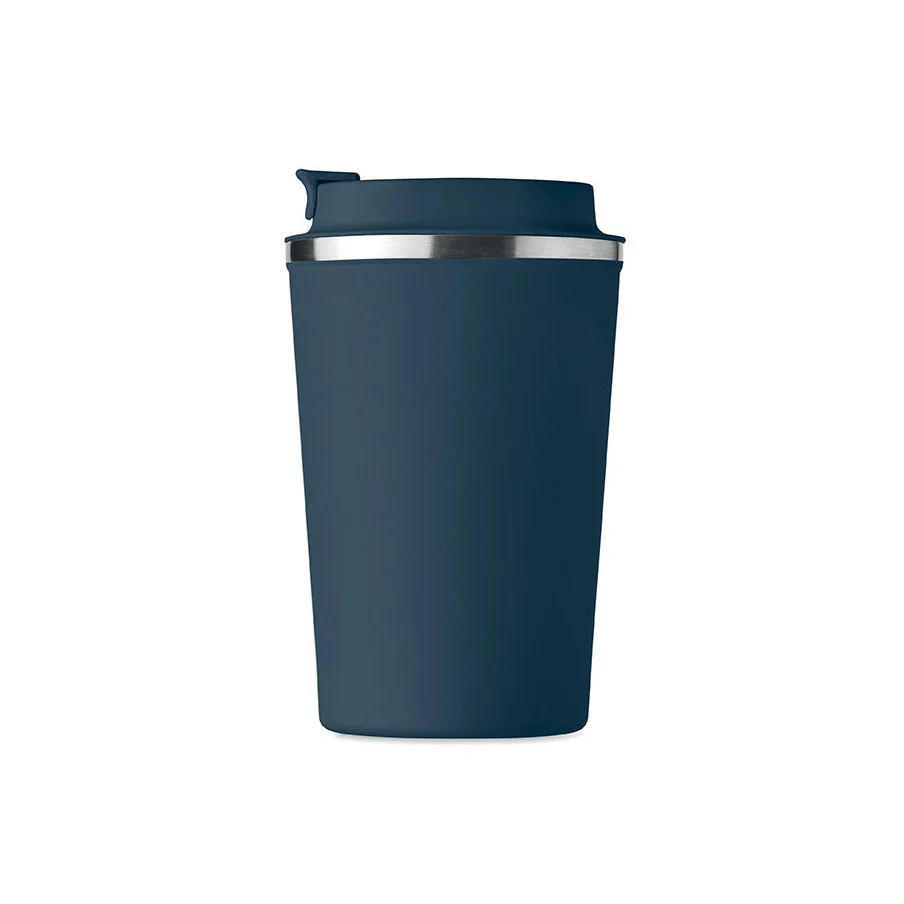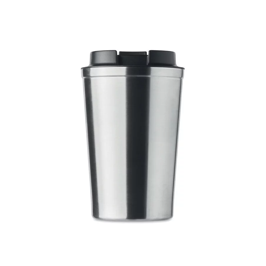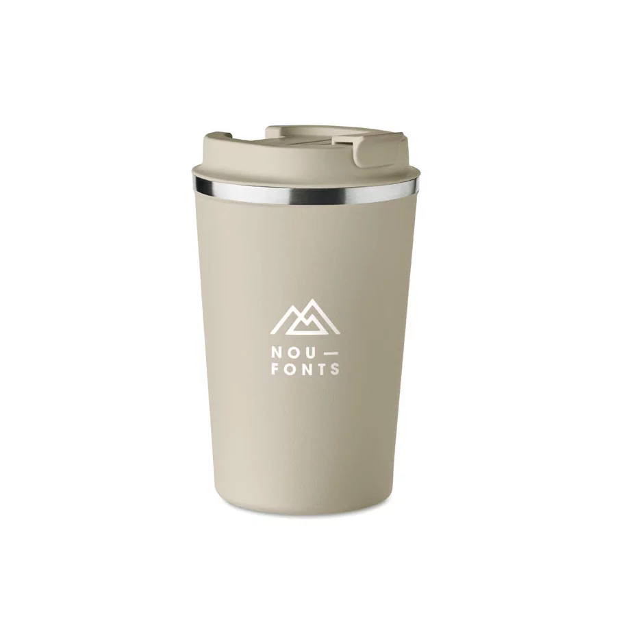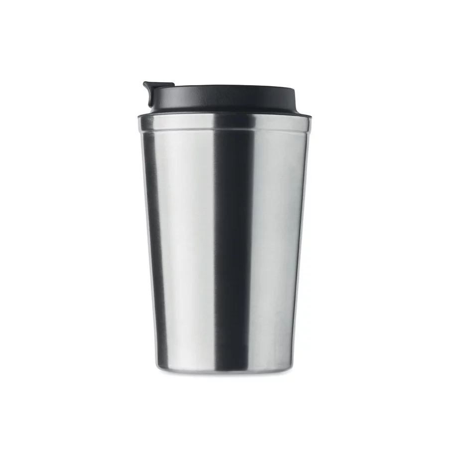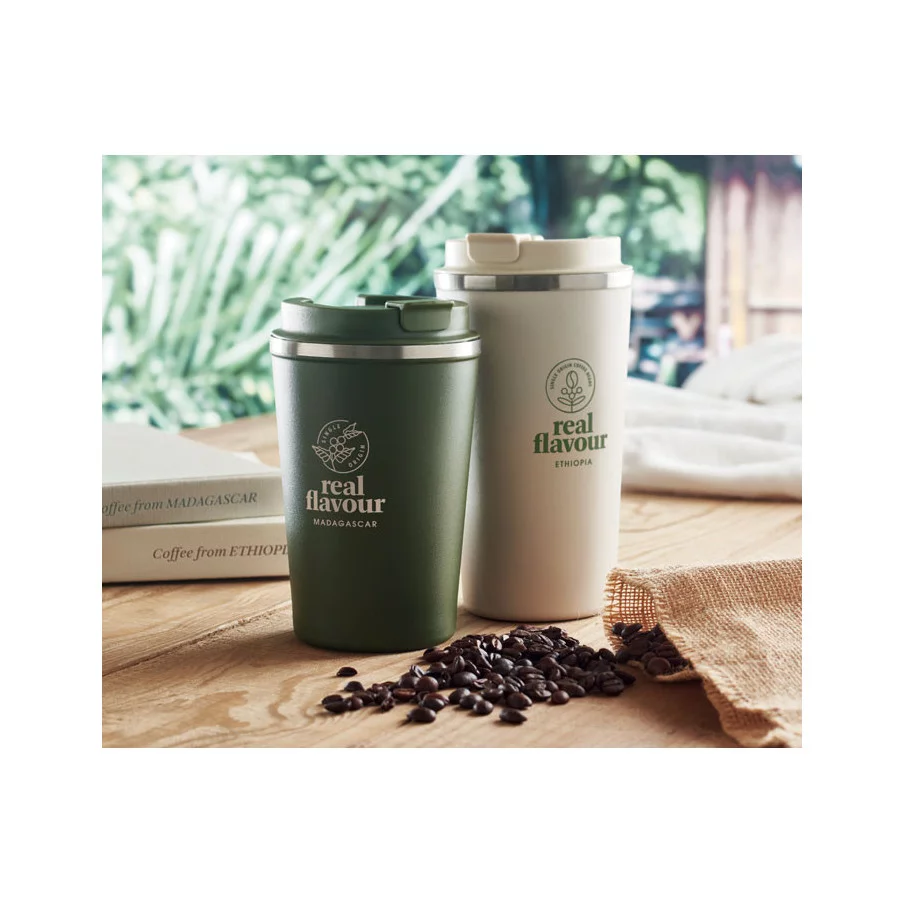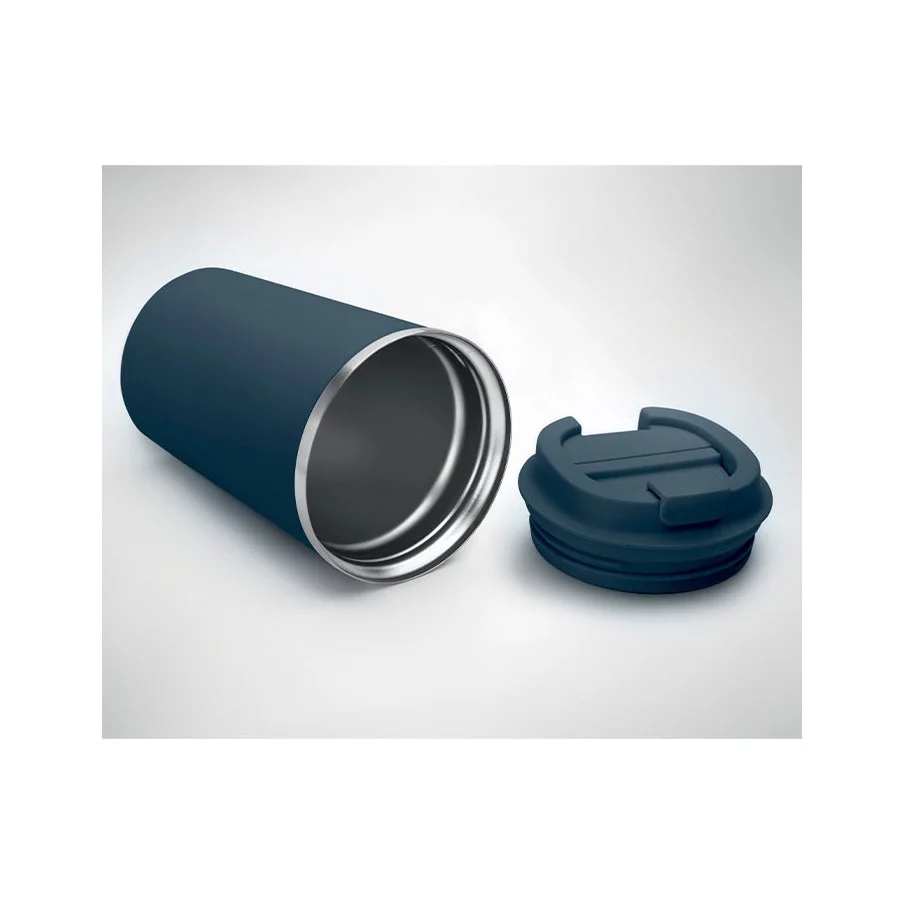 Fabriqué en acier inoxydable et doté d'une double paroi, ce gobelet de voyage publicitaire est parfait pour emporter votre café ou thé tout au long de la journée. La contenance est de 350 ml et son couvercle en PP possède un système antifuite.