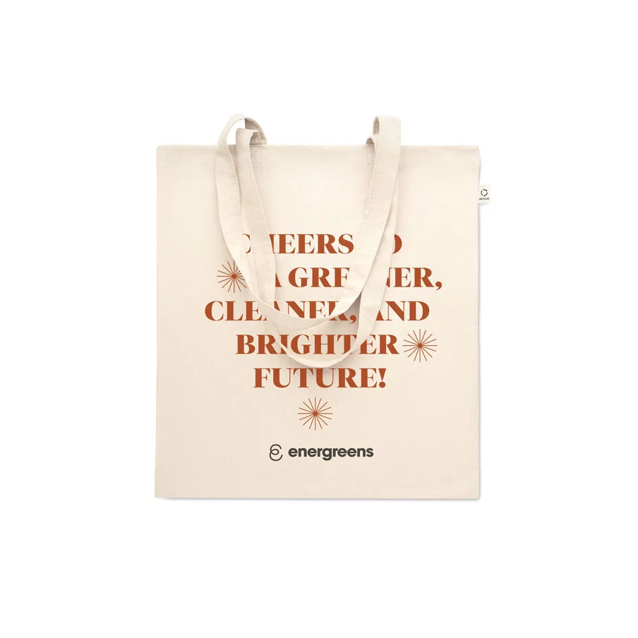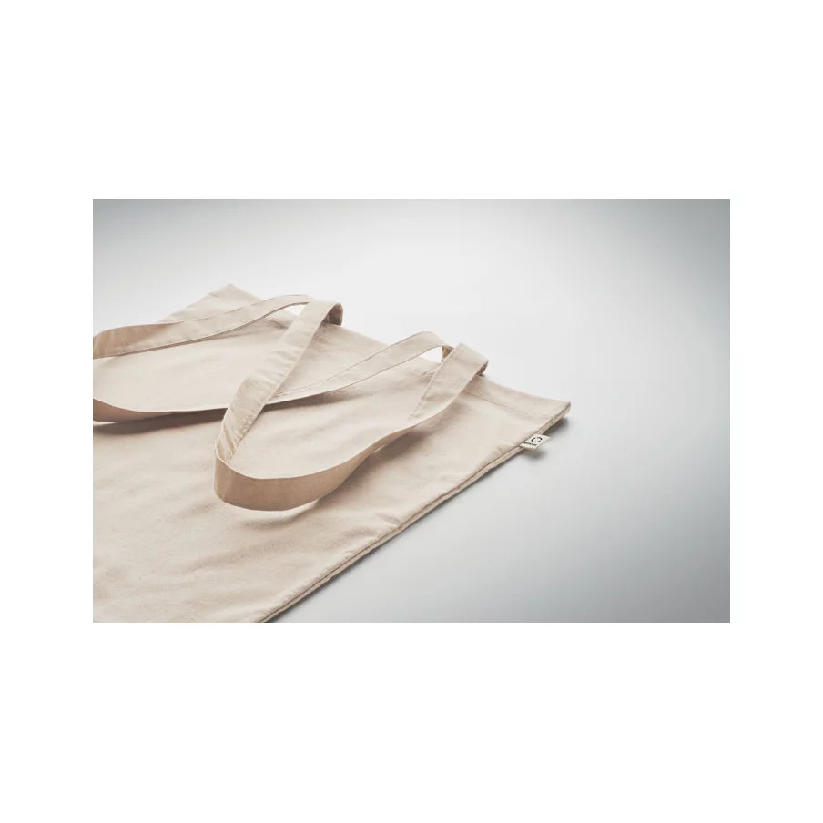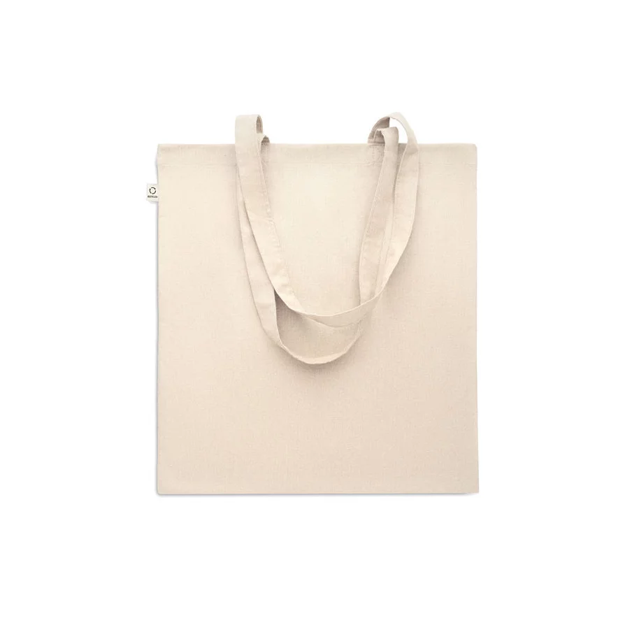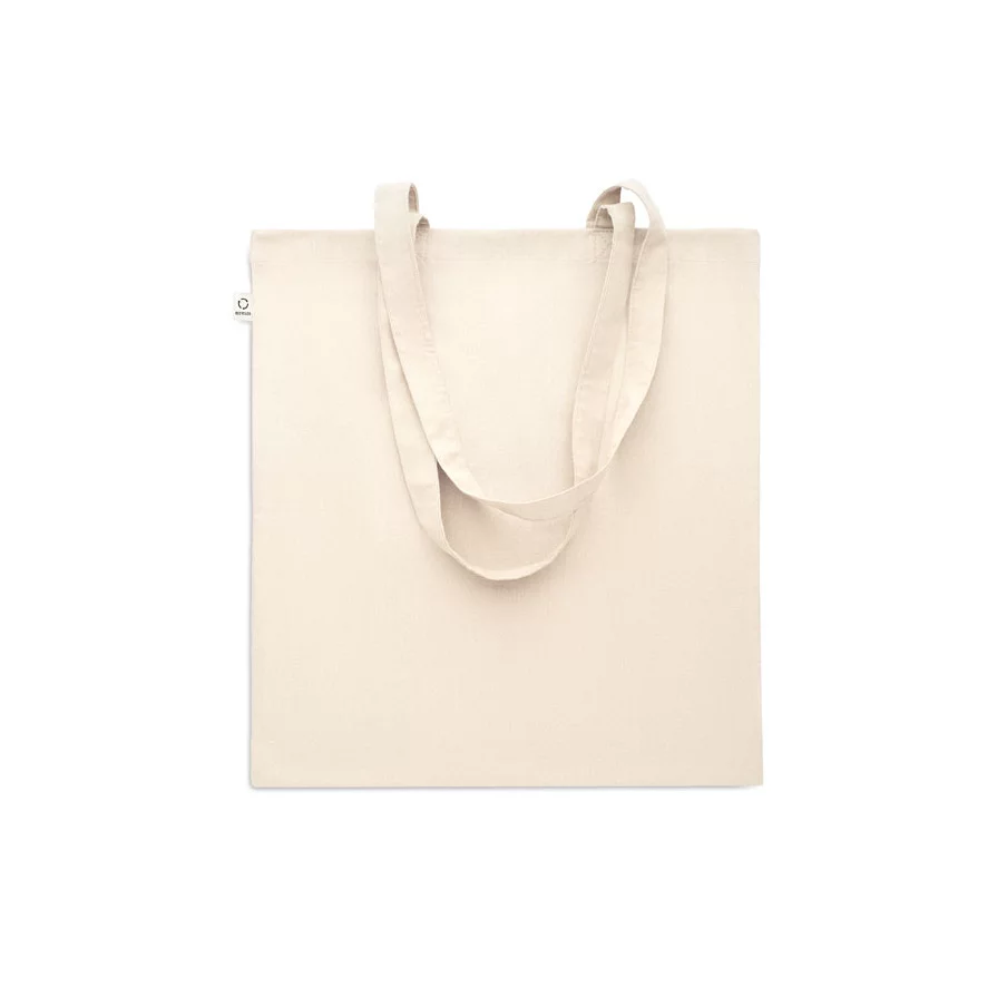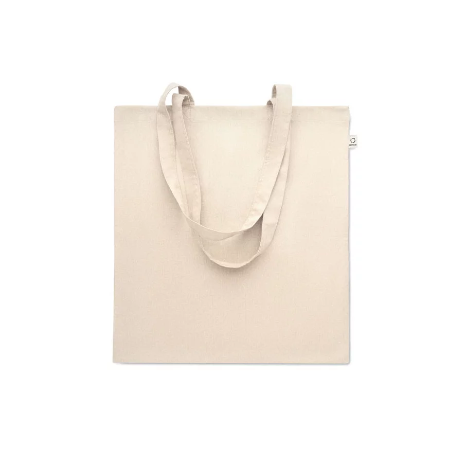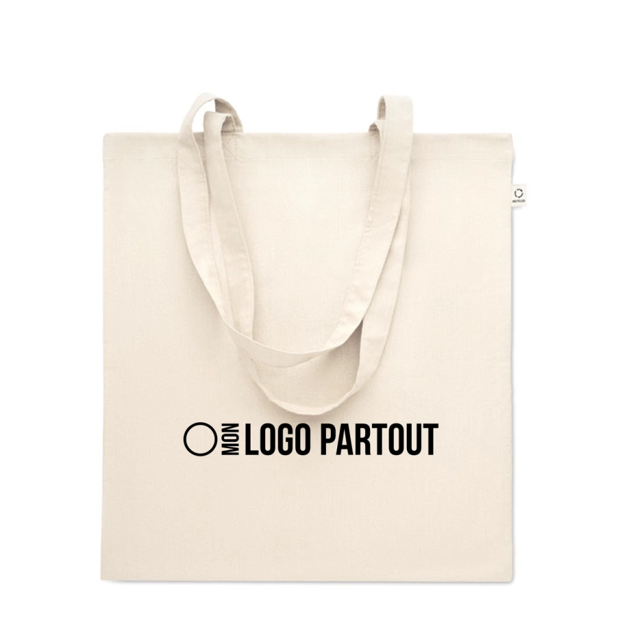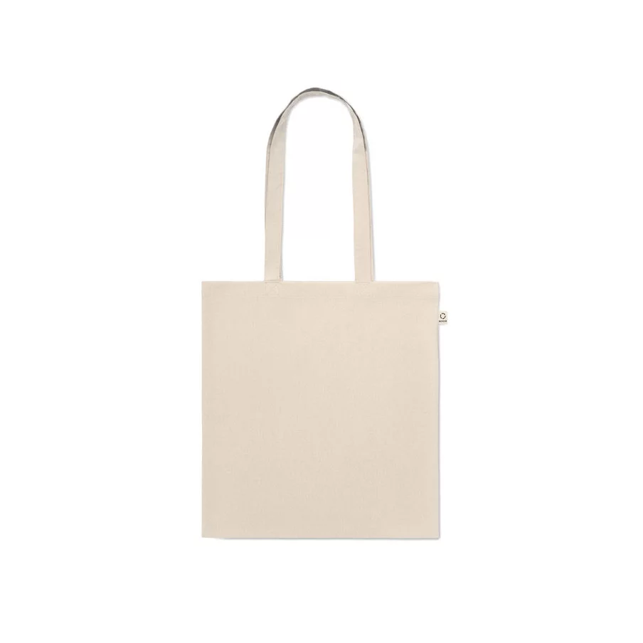Ce tote bag est fabriqué en coton recyclé pré-consommation (70% coton recyclé et 30% RPET). Il est doté de longues poignées et possède un grammage de 140 g/m².