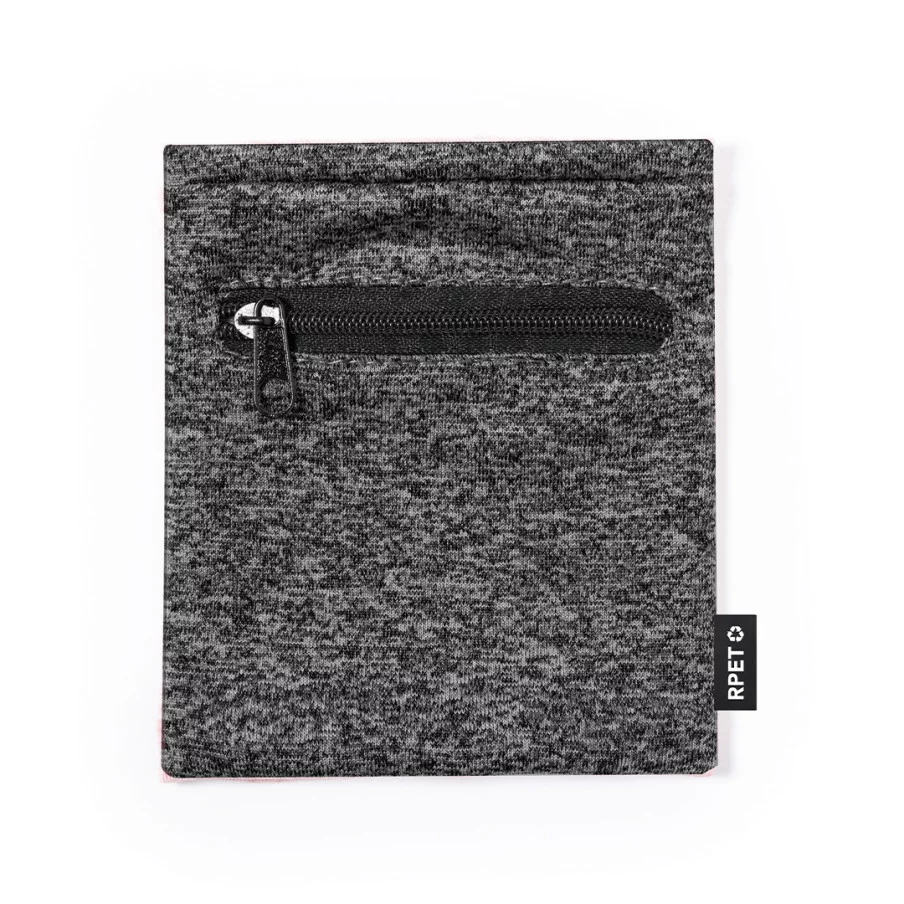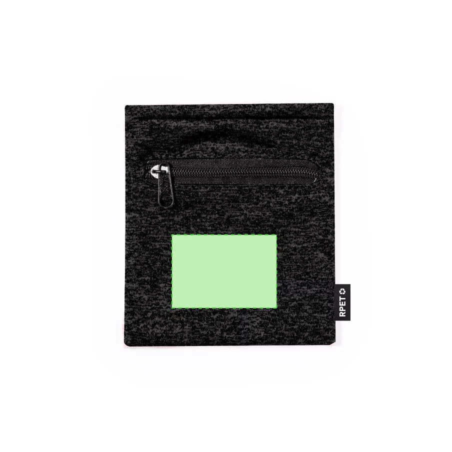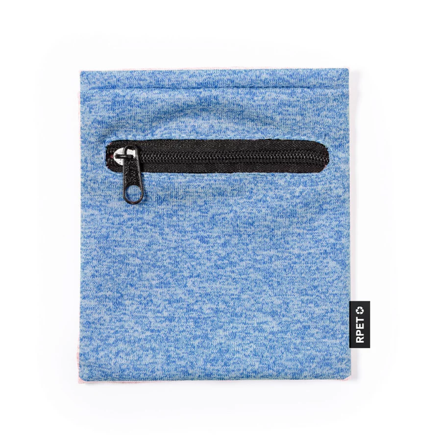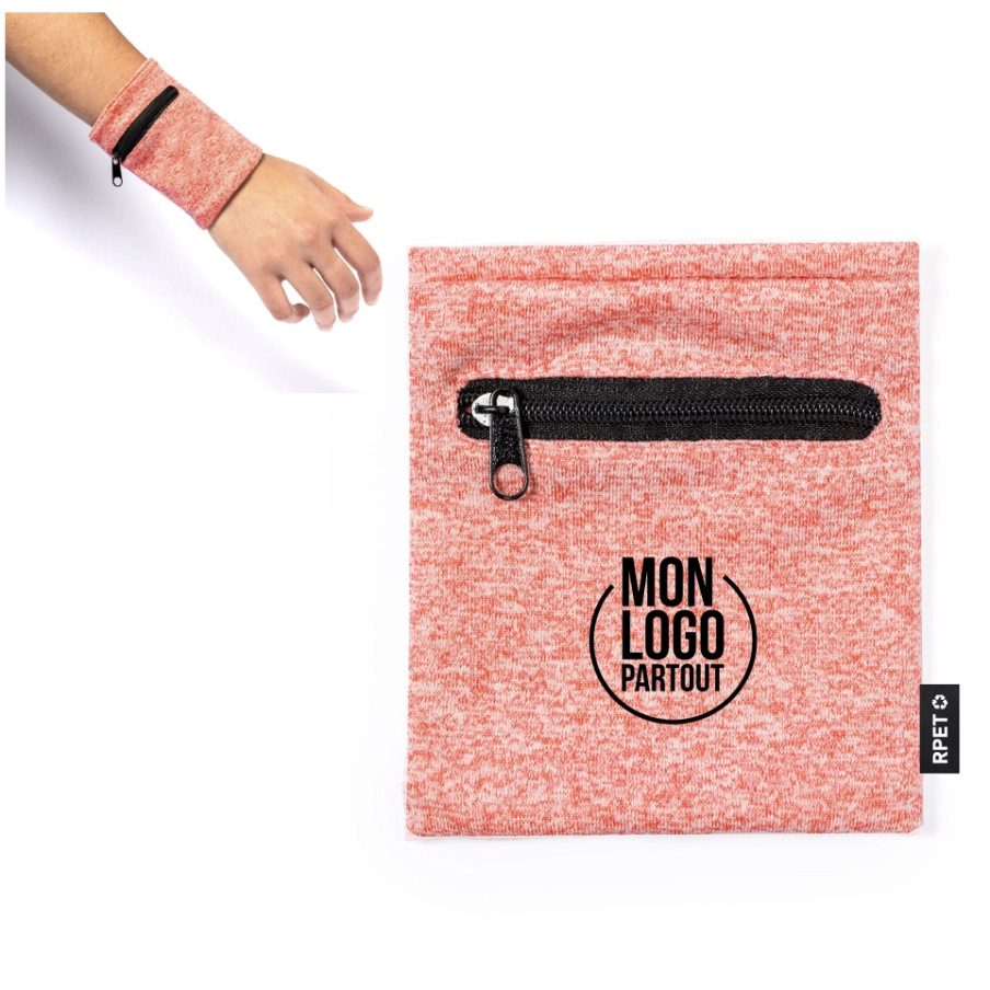 Cet accessoire est un bracelet en polyester doux RPET qui dispose d'une poche avec fermeture à glissière noire pour ranger de petits objets.