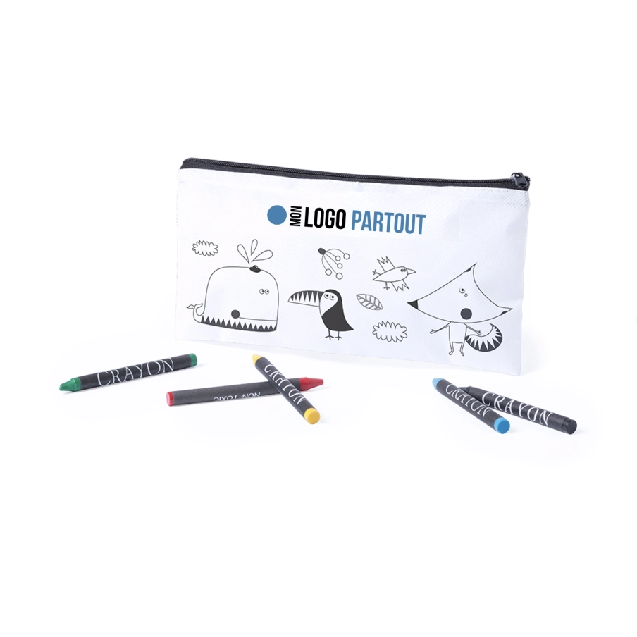 Goodies fun et ludique, découvrez notre trousse blanche spécialement conçue pour le coloriage avec 5 crayons de couleurs en cire.
