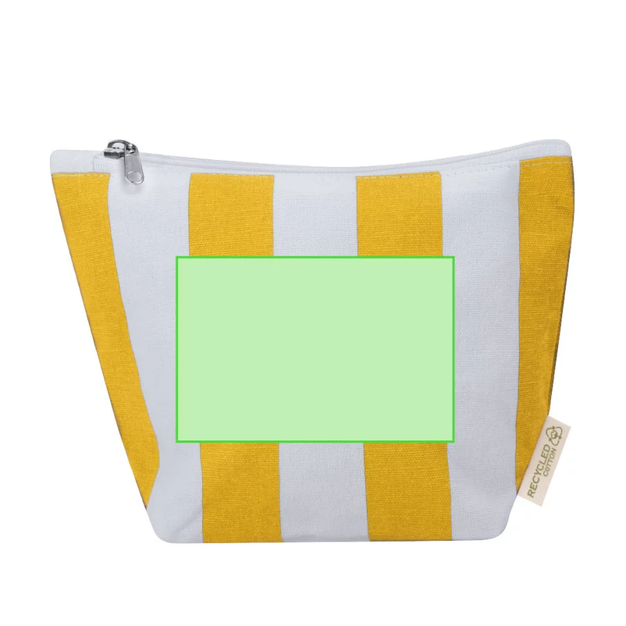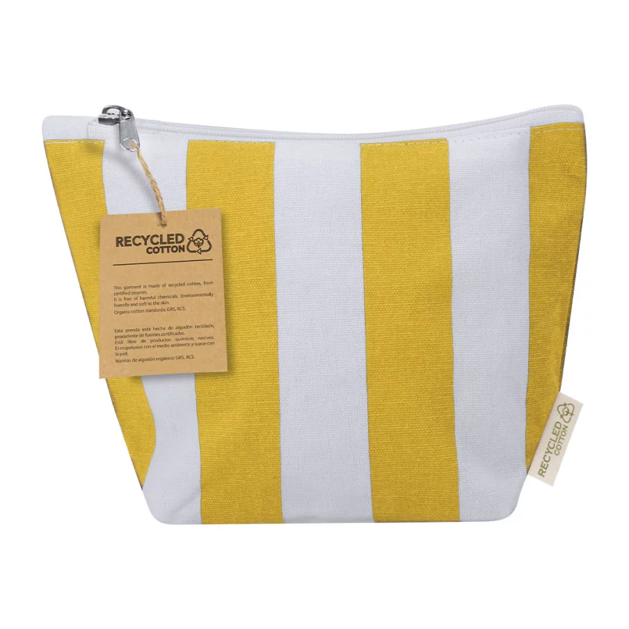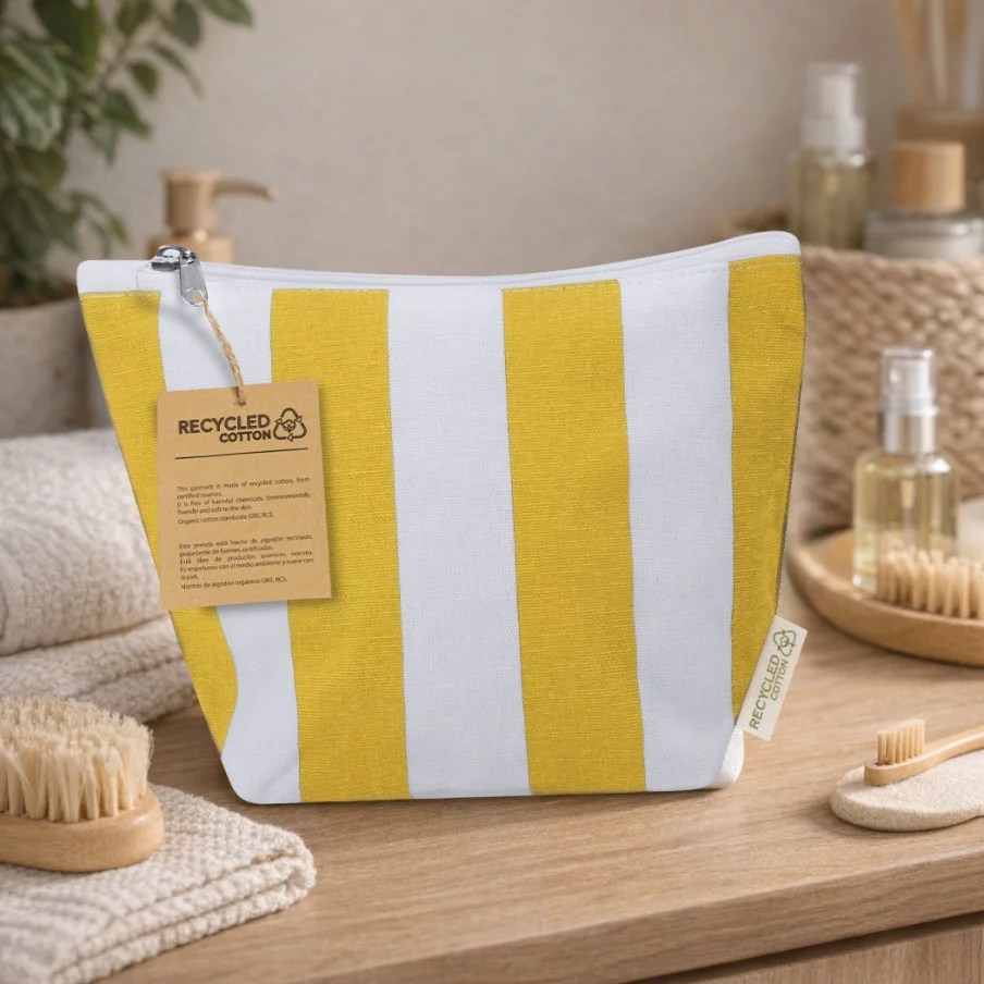 Cette trousse de toilette haut de gamme est fabriquée à partir d'un mélange de coton recyclé et de polyester RPET au grammage supérieur de 220 g/m². Elle arbore un motif à rayures verticales élégant et dispose d'un compartiment principal zippé robuste.