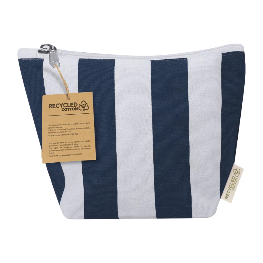La trousse de toilette personnalisée Goniax se démarque par la densité de sa toile (220 g/m²), offrant une tenue et une durabilité accrues pour un usage intensif. Son motif à rayures verticales lui confère une esthétique moderne et élancée, changeant des designs classiques. L'alliance du coton recyclé et du polyester RPET permet d'obtenir un accessoire à la fois souple et résistant. Comme pour le reste de la gamme, l'étiquette extérieure "Recycled Cotton" atteste de l'origine des matériaux et souligne la démarche de valorisation des ressources textiles.