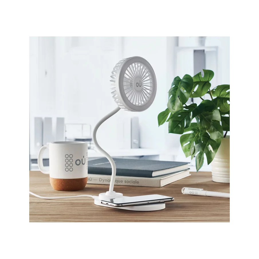 Le ventilateur publicitaire Viento est fabriqué en ABS. Il possède 3 vitesses et une lumière LED 80 lumens. Ce produit dispose d'un chargeur par induction de 10 Watts. Sortie : DC 9V/1.1A (10W) charge rapide. Compatible derniers Androïdes, iPhone® 8 et plus récents.