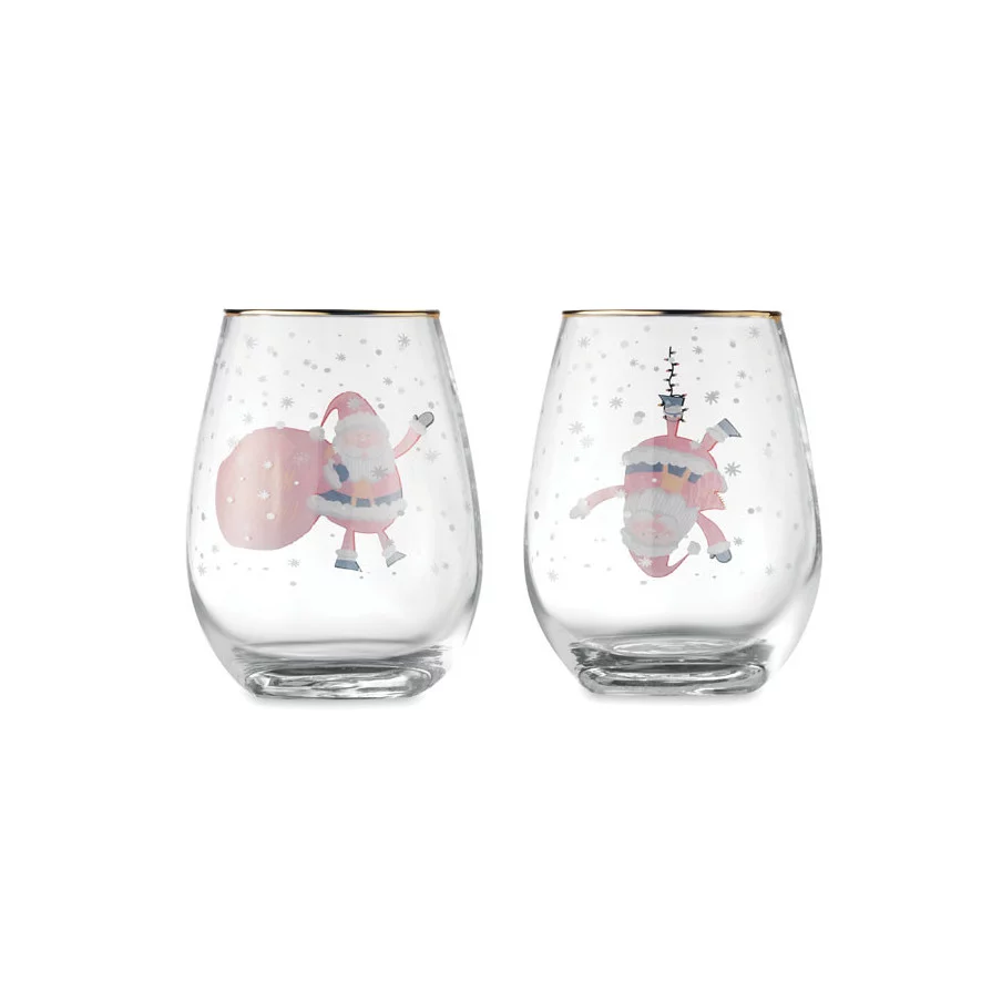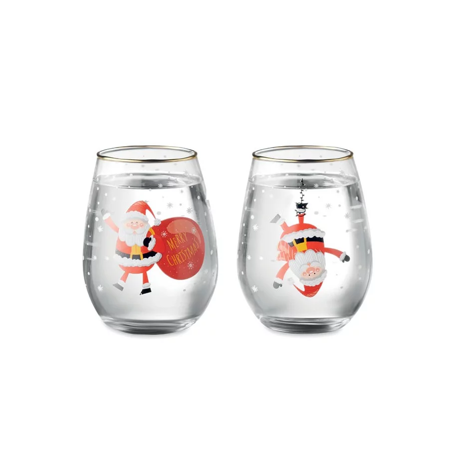 Découvrez notre lot composé de 2 verres de Noël avec bord doré personnalisable d'une contenance de 330 ml. . Présentés dans une boîte cadeau elle aussi personnalisable.