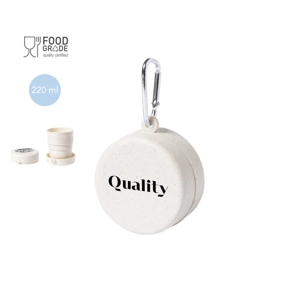 Personnalisez notre gobelet pliant en PP veiné sans BISPHÉNOL A. D’une capacité de 220 ml, avec mousqueton métallique pour le transport, ce verre pliable est doté d'une certification de qualité alimentaire.